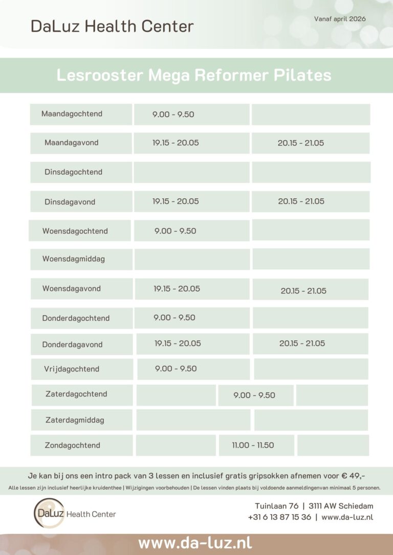 Bij Da Luz Health Center introduceren wij als eerste in Schiedam de innovatieve Megaformer Pilates. Een krachtige en verfijnde trainingsvorm waarin kracht, stabiliteit, flexibiliteit en lichaamscontrole samenkomen in één effectieve workout.